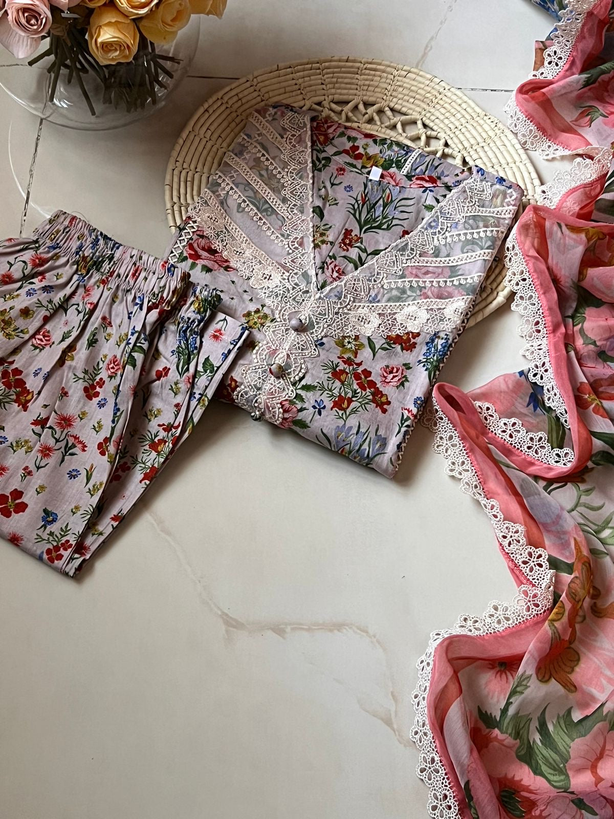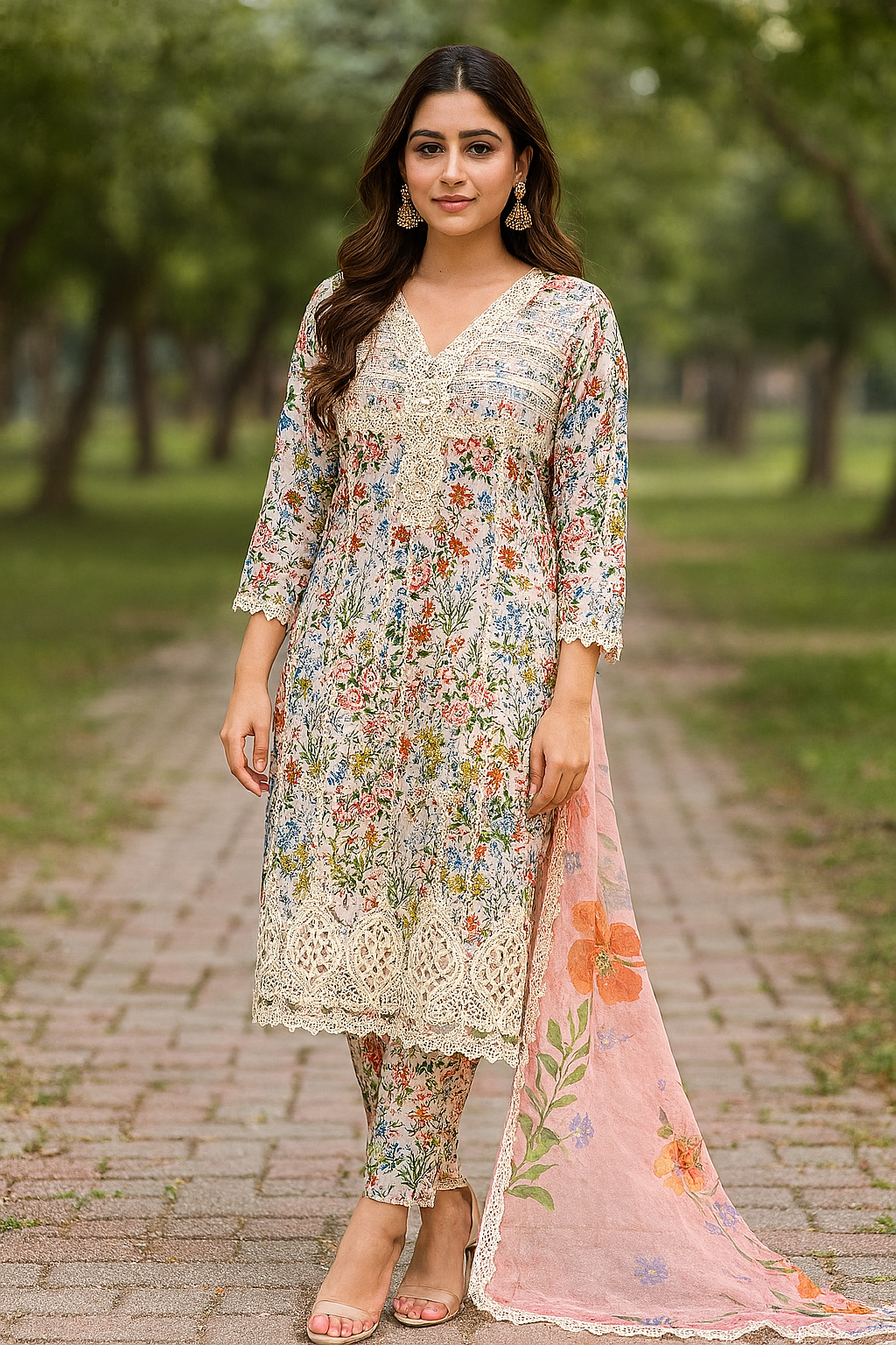 3 Piece Stitched Lawn Digital Suit with laces and tussalss. These suits are made of high-quality lawn and are beautifully stitched with added laces for a touch of elegance. You'll feel confident and stylish in this sophisticated and expertly crafted outfit.