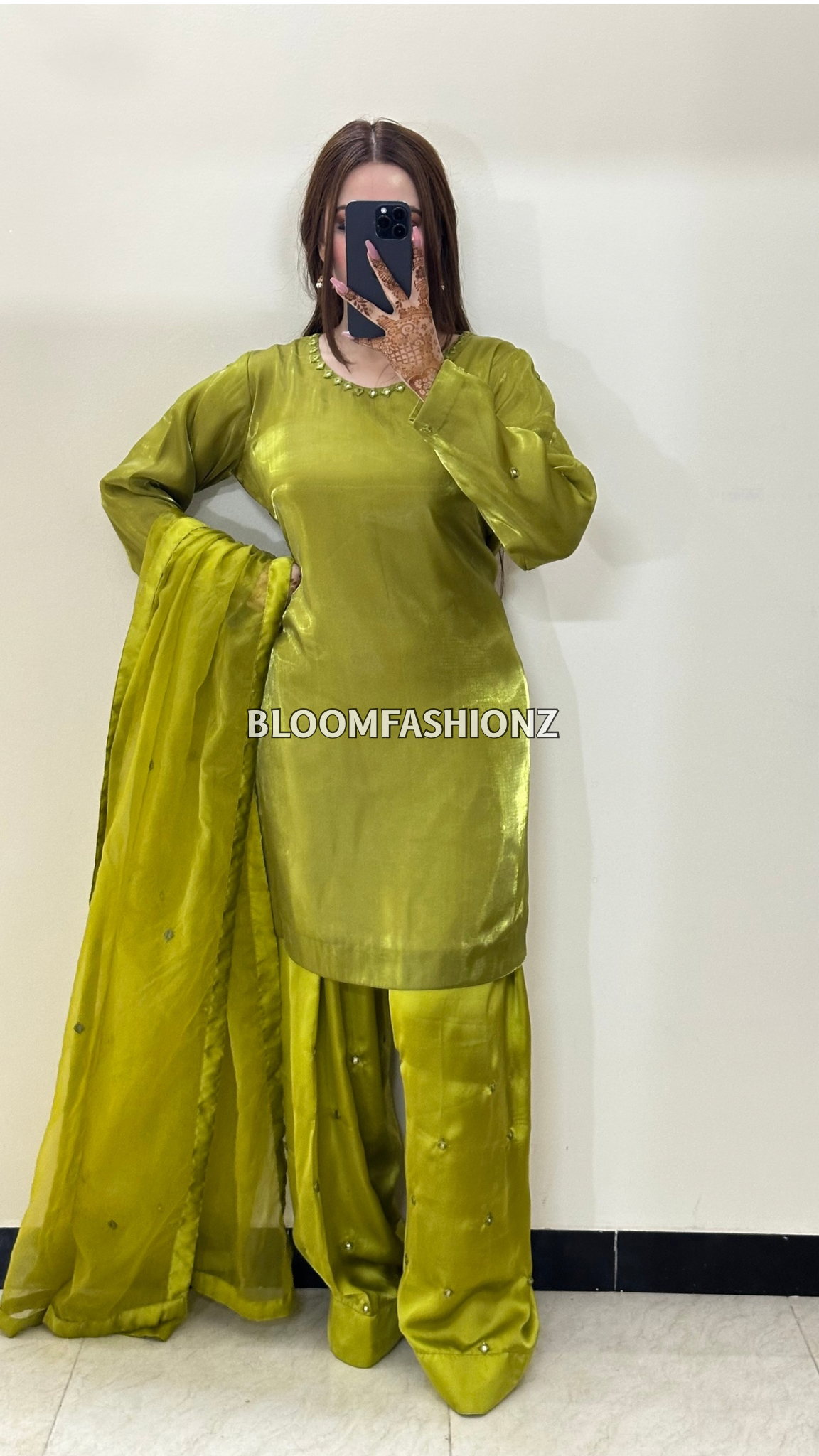 Step into grace with our latest collection, Wafa, crafted from luxurious sheesha silk. This refined ensemble features a classic Farshi shalwar paired with a graceful organza dupatta, all delicately adorned with mirror work that glimmers across the Shirt, shalwar, and dupatta. Every detail speaks of heritage, elegance, and understated opulence.
