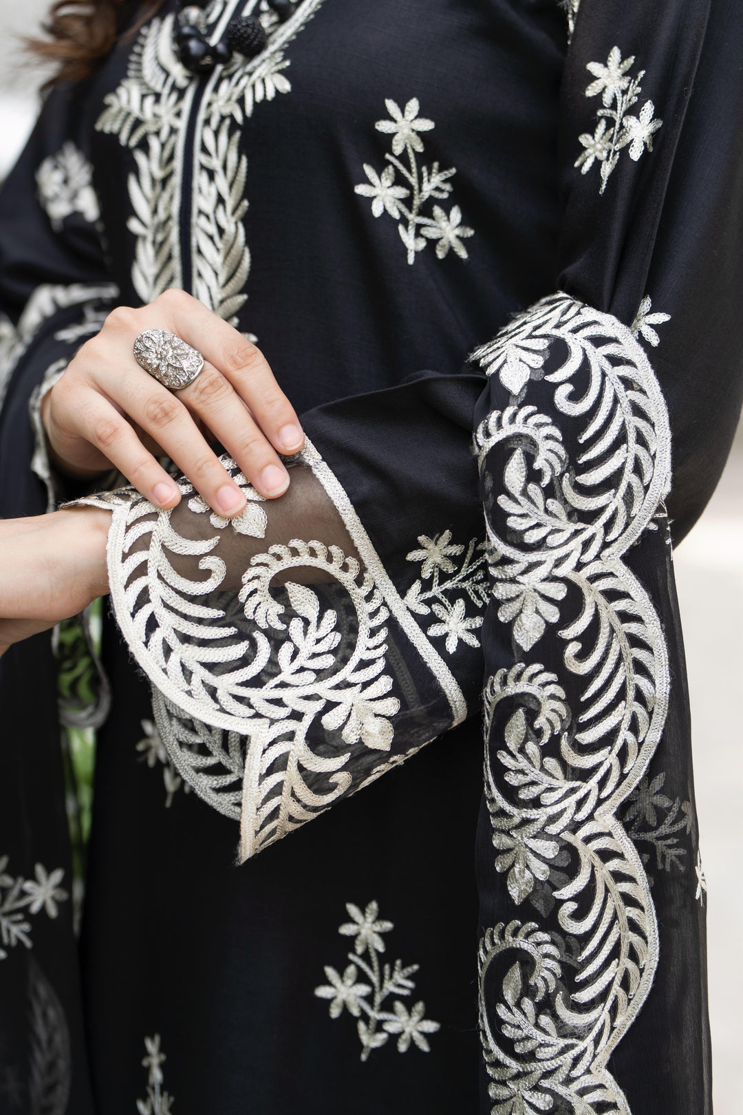 A timeless black slub linen outfit adorned with delicate white embroidery and a beautifully bordered chiffon dupatta. Perfect for creating a graceful and sophisticated look. 🖤