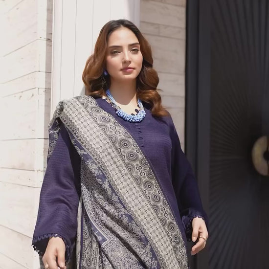Simplicity in its finest form , navy Dhanak paired with a geometric wool shawl, blending minimal design with winter charm.